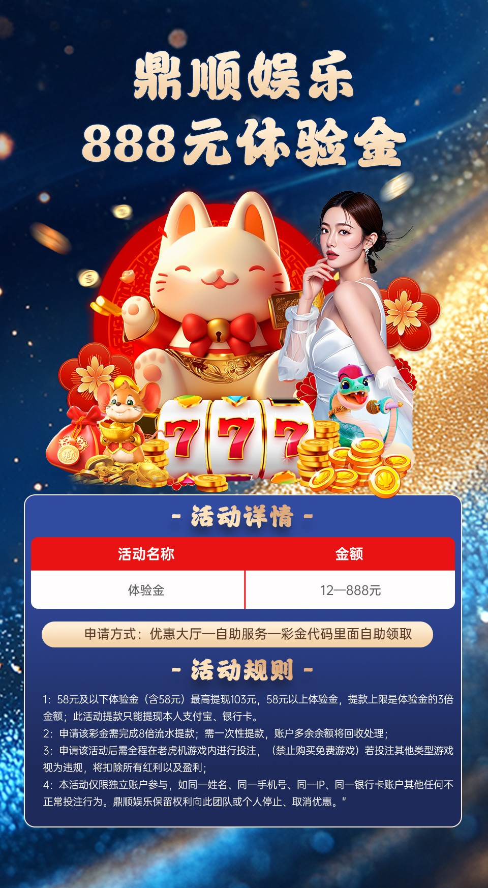 3、该活动仅限投注电子游戏,彩金提款上限103,多余金额需扣除,禁止购买免费游戏,藏分, 互转,违反扣除所有金币;